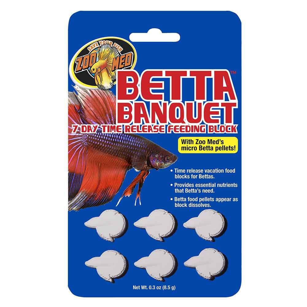Zoo Med's Betta Banquet Food Blocks are made with whole Micro Betta Food Pellets and Krill to provide essential nutrients that bettas need. As the block dissolves, Betta Food Pellets are exposed allowing your betta to feed throughout the day. Each block will feed one betta for up to 7 days depending on the pH and hardness of the water. Be sure to perform routine water changes regularly.